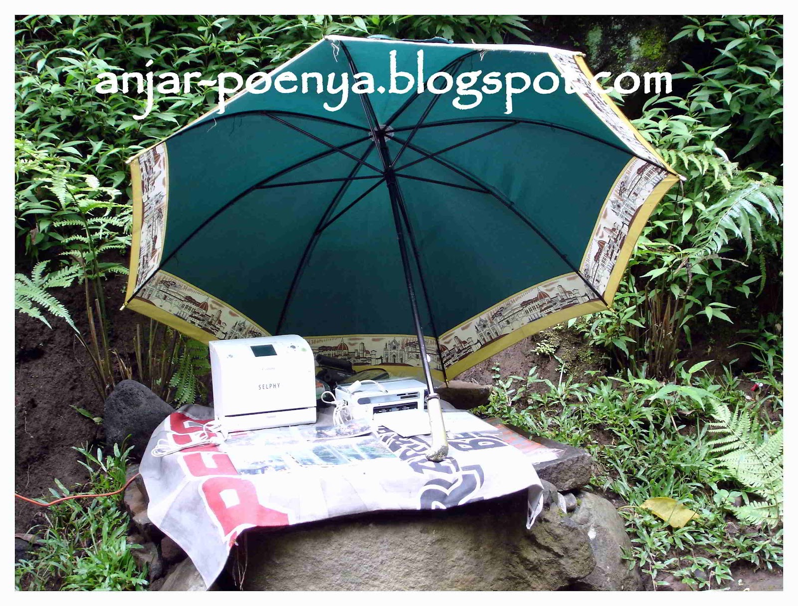 Itu tu, perlindungan dari terpaan air terjun dengan menenggerkan payung hijau